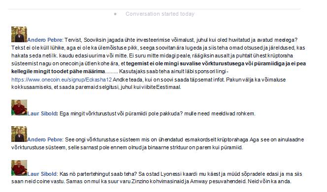 3. OSA: Võhivõõras soovitab välja kasvada püramiidkseemidest, kiites võõrastele spämmates onecoin püramiidkseemi. Järgmise osa vaatamiseks klõpsa foto paremal küljel või vajuta klaviatuuril paremat nooleklahvi.